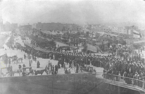 The dress of the crowd is Edwardian, there are trams, there are horse drawn carriages, there are tropical trees, a huge square and a garden. There is a church on the left of the picture in the background. Then there are the soldiers and the flags.