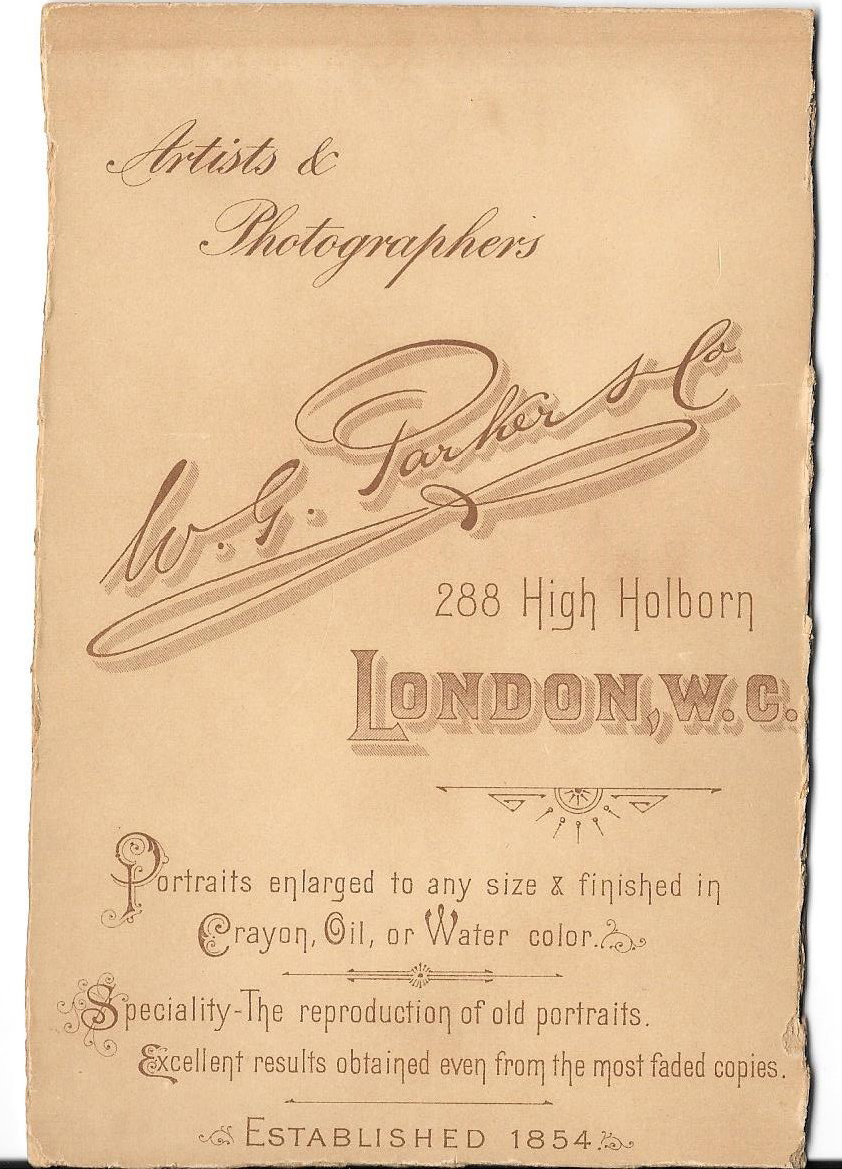 Looking on the reverse, we can see that the photographer was William Gee Parker who ran a photographic studio out of 288 High Holborn, London from 1890; the studio being taken over by his son in 1903 and continuing until the son’s death in 1935. This photographer seems to have had a rather colourful life, however we are interested, in this instance, in the gentleman in the picture, so we shall leave his history hidden for now.